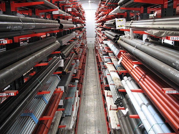Cantilever racking is designed to store long, bulky items like pipes, timber, and steel bars. It features arms extending from a central column, allowing easy front access for loading and unloading.
